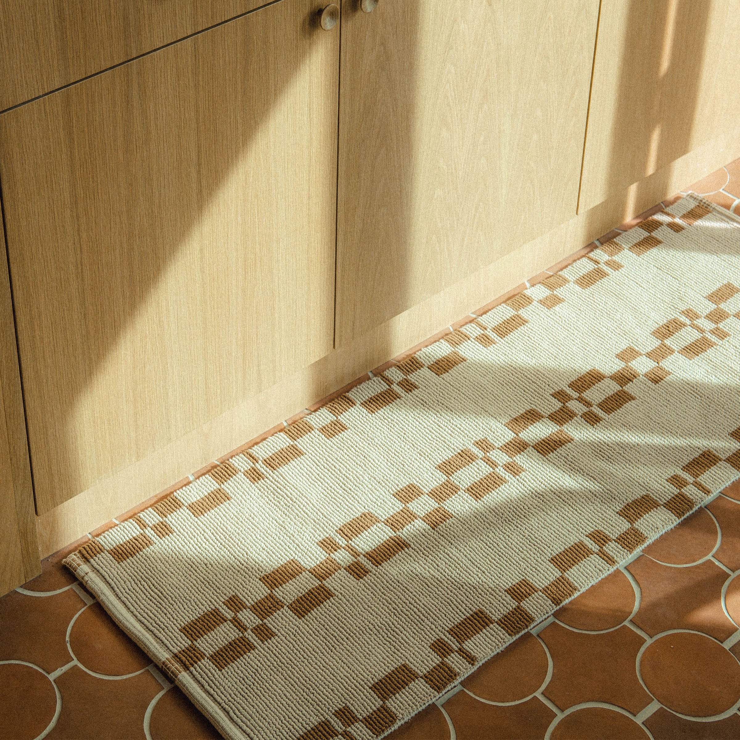 Alina is our newest style of rug, featuring a smooth surface created by small tight loops. This hand woven piece has a hazelnut geometric pattern on a cream background. Offered in two sizes, we love this washable rug for kitchens and bathrooms.