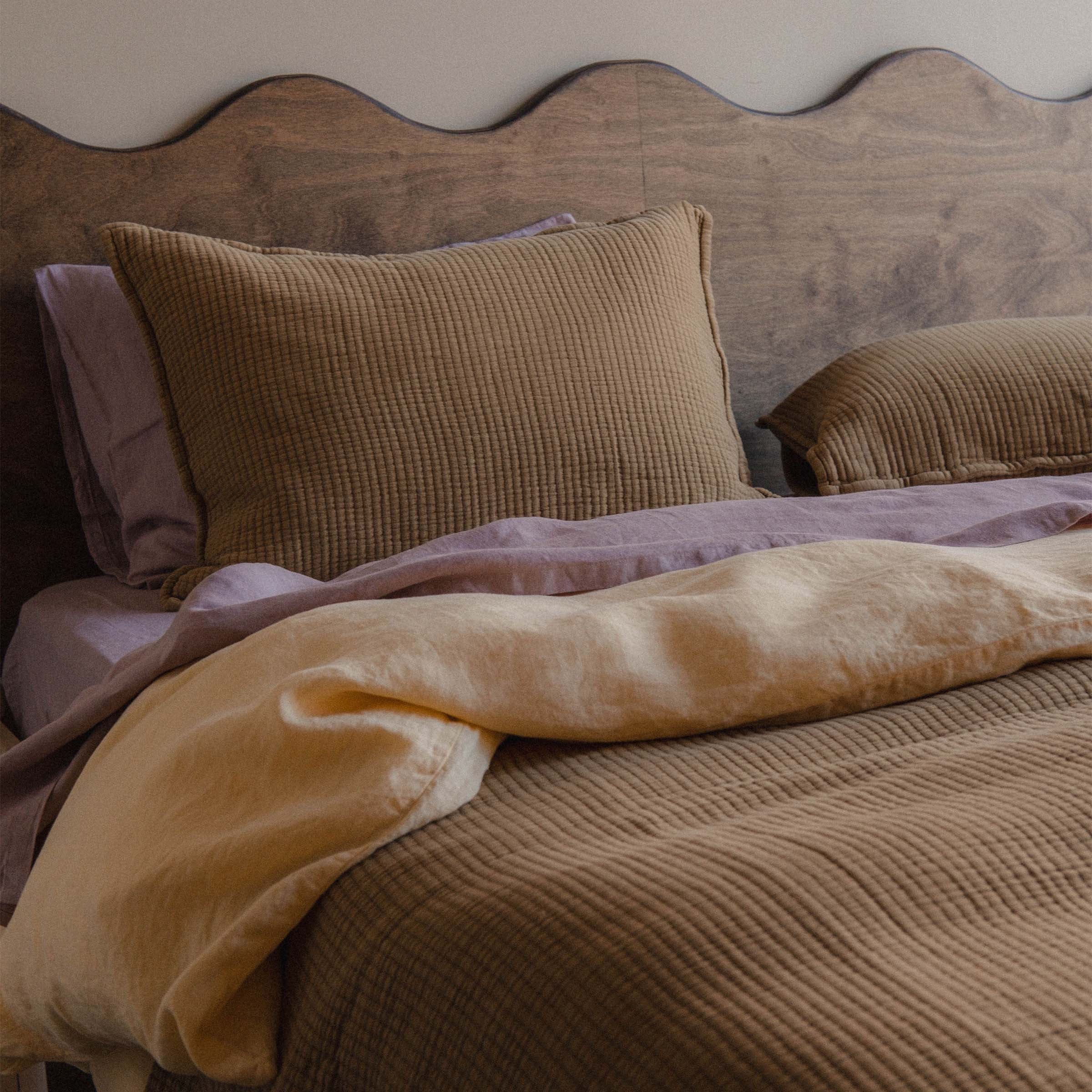 Gia is a cotton coverlet featuring a textured stripe pattern. Offered in Willow and Ecru, this piece can be layered over a duvet during the cold seasons or used by itself in warmer weather.