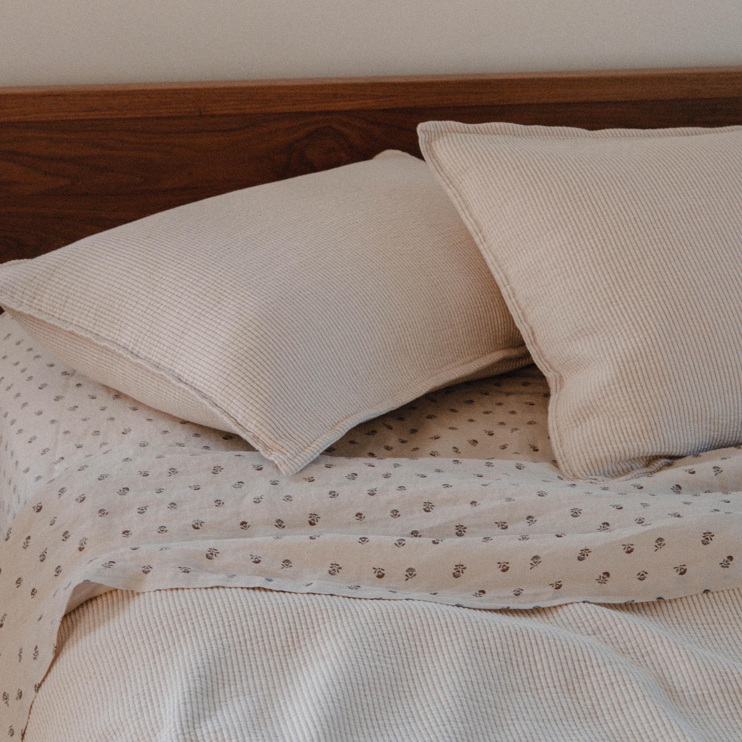 Lola is a vintage inspired coverlet set with an ecru background and subtle stripe pattern created by contrast taupe threads and a traditional matelasse weave. This cotton set can be layered over a duvet during the cold seasons or used by itself in warmer weather.