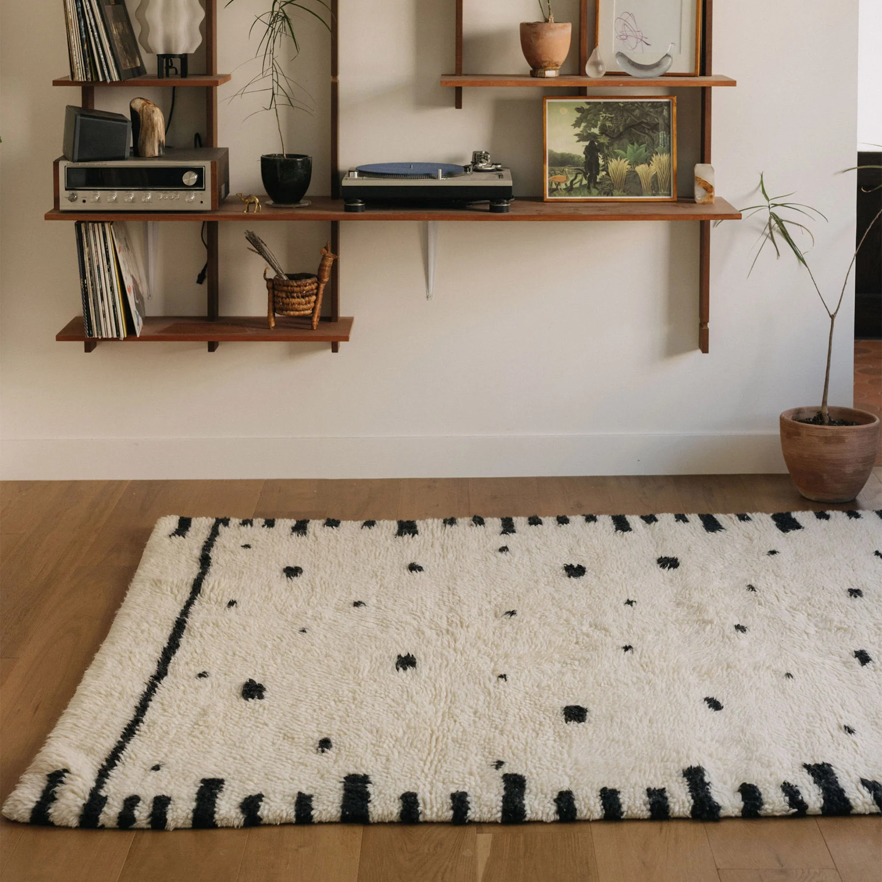 Inspired by vintage Moroccan rugs, the Miro Rug is handwoven and features a naturally imperfect black and cream design.